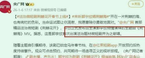 谁能料到,曾经在长剧里跑龙套、住800元出租房的女孩,如今竟成了央媒镜头里的香饽饽。1月6日,央广网的一条微博瞬间引爆全网,不仅官宣郭宇欣担纲首部法制微短剧女主角,更放出了她献唱的主题曲。这份跨越次元壁的认可,让大伙儿猛然惊觉,郭宇欣不再只是那个在短视频里谈情说爱的“网红演员”,而是真正拿到了主流市场的入场券。